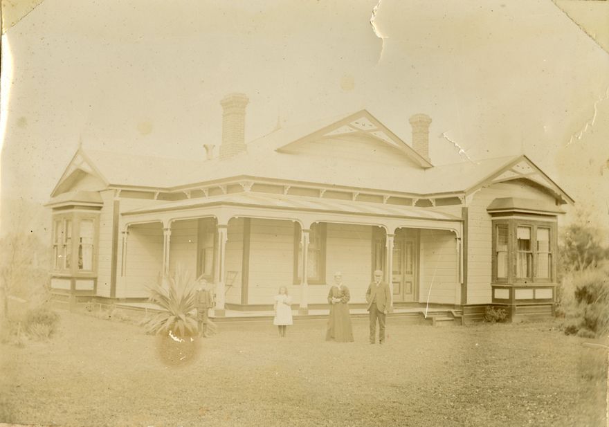 Mr. Arthur Bauckham, and his wife Julia and child, are shown here outside there house “Eastbury”. Mr. Bauckham built this house in the early 1900s. Mrs. Fowler a well known resident of Ashhurst lived in the house until c1985. The original address was 194 Cambridge Avenue but the driveway and access is now 55 Lincoln Street, Ashhurst.