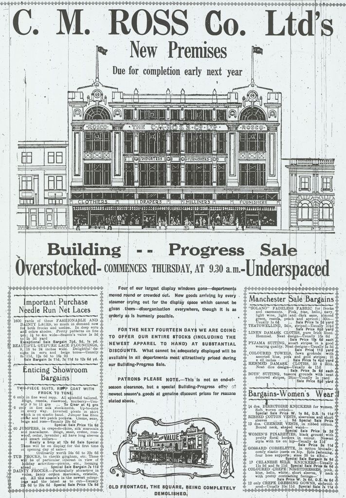 C M Ross Co Ltd newspaper advertisement of sale held during the construction of their new store in The Square of Palmerston North. The C M Ross Company continued trading where possible throughout the construction during 1927-1928.