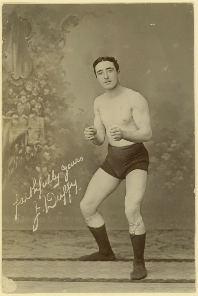 - This photograph shows an unidentified athlete in boxing stance. He is also one of the subjects in the "Demonstration of Ju-Jitsu" series. It is signed, 'faithfully yours, J Duffy'.