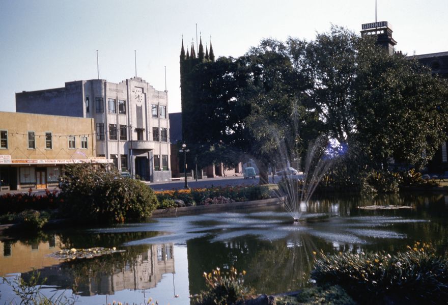 Photo taken by Terry Finnerty, photographer. Looking across Butterfly Lakelet with fountain, to the corner of The Square and Church Street West. From the left of the picture can be seen Young Fruit Supply, the Municipal Chambers, All Saints' Church. Opposite the church, on the right, is the Grand Hotel. Several fountains were added to the Lakelet in the early 1960s.