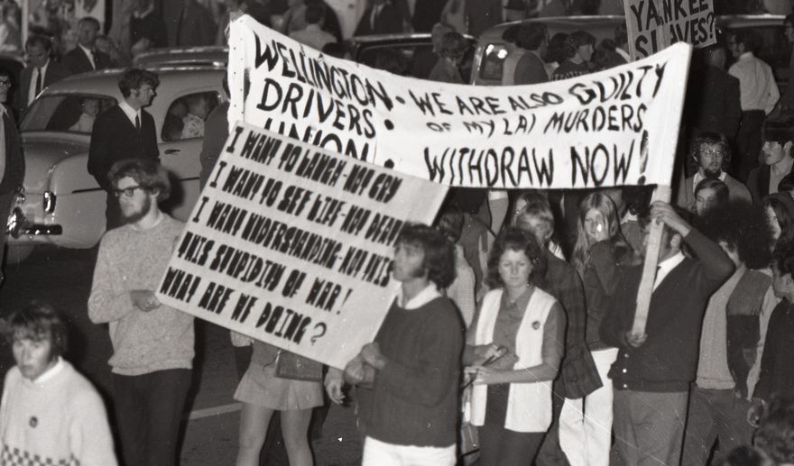 The March was organised by the Palmerston North Anti-war Mobilisation Committee, including R. Lyall, Massey University Student Association President Gary Emms, and Unionist Alan Millar. The Nash Street Jug Band lead the singing and Hana Burke sang ‘a Maori song of parting’. Poetry was read by Mr. Lyall and Des Woods. The Reverend Loyal Gibson of the Trinity Methodist Church lead prayers after Churches across the city rang their bells in solidarity.