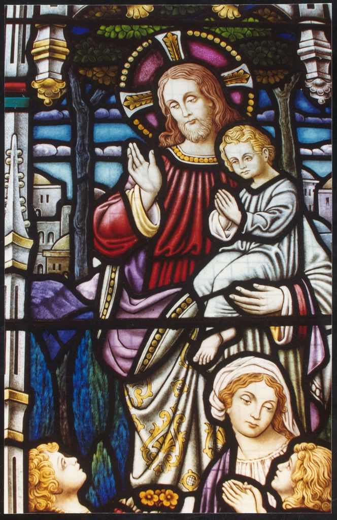 Stained glass windows as photographed from the inside of the Wesley Methodist Church. The two-piece stained glass memorial window is in honour of John Cunninghame, of Palmerston North department store Collinson and Cunninghame fame.
