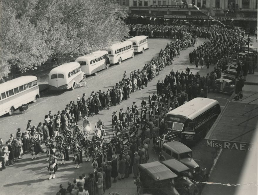 Peace with Germany was announced 8 May 1945 and official celebrations took place in Palmerston North the following day. Church services were held at 10am, followed by general celebrations. The procession marched round The Square to the Band Rotunda