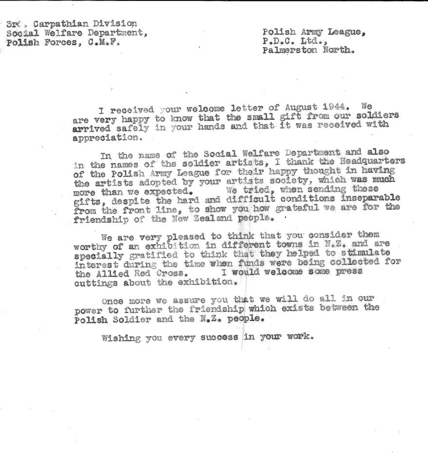 Letter from the 3rd Carpathian Division Social Welfare Department of the Polish Army, to the Polish Army League, about gifts from Polish soldiers sent as a thank you for P.A.L.'s work. The Polish Army League, founded in Palmerston North in WWII, corresponded with and sent parcels to Polish soldiers who served with the allies in World War Two.