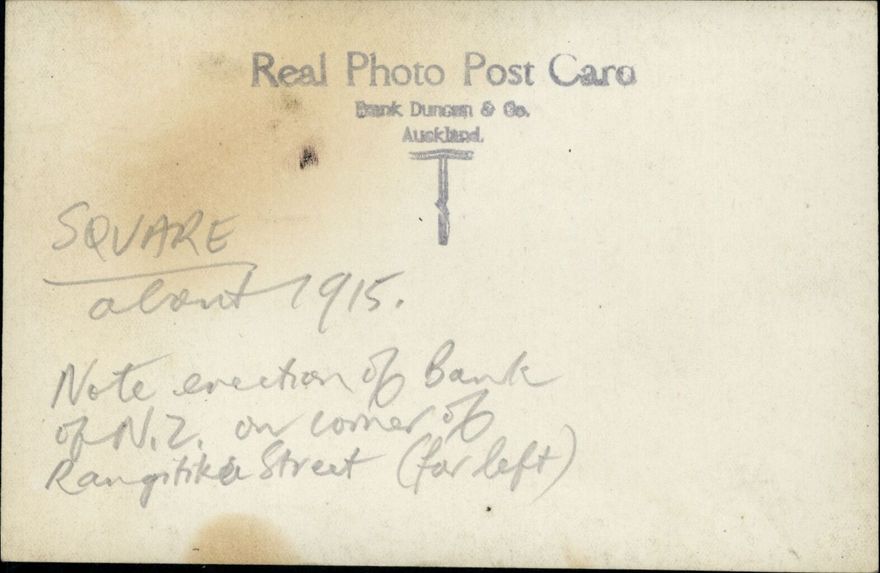 This postcard shows The Square as it was around 1915. Note the spire of the old St Patricks Church, Palmerston North to the right of of General Post Office.