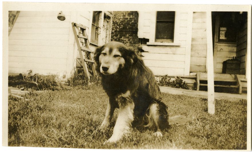 This photograph came from a small photograph album that belonged to Mrs R Andrews of Rangitikei House. This photograph has no caption and shows a dog sitting in an unidentified location.