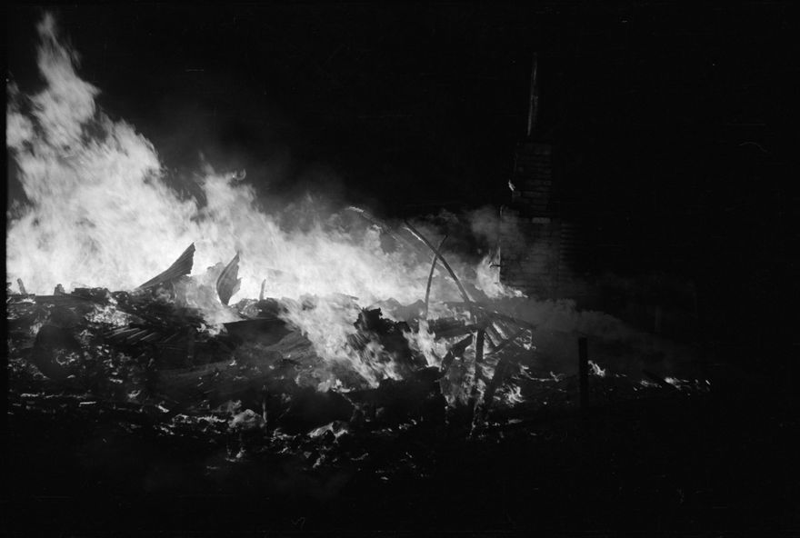 - These images were likely taken by Frank Goldingham for Photorama pictorial magazine. Two were published in the June 1960 edition. - Caption: Photographs of the fatal fire at Motuiti Road, Foxton, in which Mrs Rere Moana Kauri and her 4 1/2 year old daughter Lily perished. Our cameraman arrived about 15 minutes after the outbreak of the fire which burnt the old wooden building to the ground