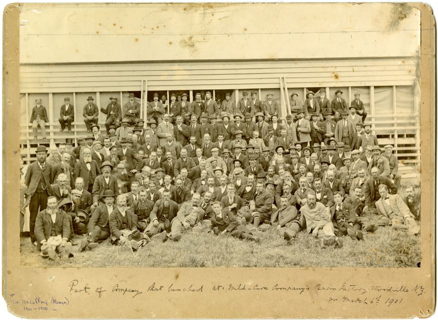 Shareholders on a tour of the Mild-Cure Bacon Company. A detailed account of the visit appears in the Woodville Examiner, Volume XIX, Issue 3234, 8 March, 1901.