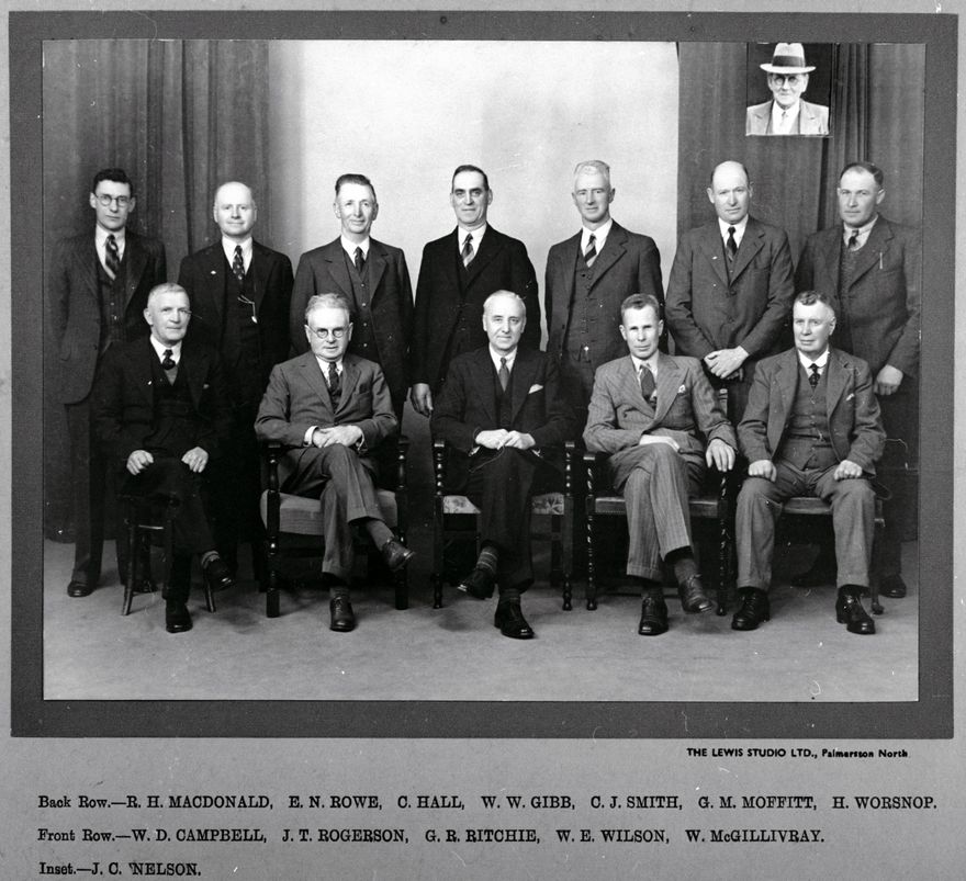 Shown here the executives and buying staff of the Longburn Freezing works. Back Row: R. H MacDonalds, E.N. Rowe, C Hall, WW Gibb; G J Smith; GM Moffitt, H. Worksnop. Front Row: W.D. CAmpbell; J.T. Rogerson; G.R. Ritchie; W.E. Wilson and W Mcgillivray. Inset J.C. Nelson