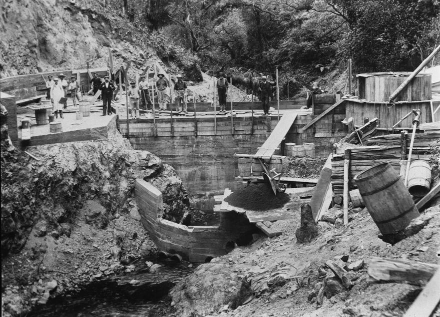 This dam constructed in 1906-1907, replaced the smaller weir, built in 1888-1889 to supply water for Palmerston North. The new dam was increased in height to 50 feet soon after. It opened 1913 and operated until 1957, when a 100 foot high dam was constructed. Samuel Jickell, Borough Engineer 1904-1919, standing on the far right.