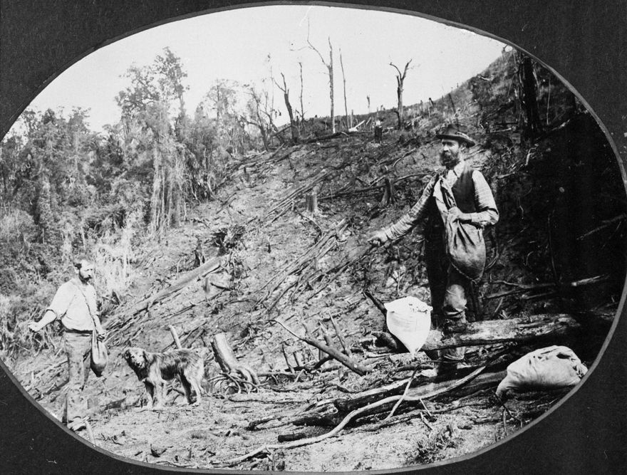 Information on rear of photograph reads: “Sowing The Seed (Kentucky Blue Grass). This picture gives a good idea of the nature of the country in which the seed is raised. Mr Thos. Harrison, who had been so successful in this industry, is here shown sewing Kentucky Blue Grass.” Mr G A Hart states that Harrison’s farm was situated on the Pohangina Valley West Road, about two miles south of Utuwai School.