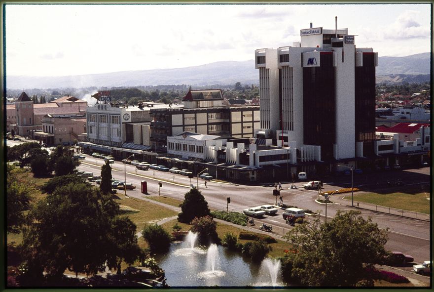 Taken from the Civic Administration Building of PNCC. Overlooks the Butterfly Lakelet towards the corner of Fitzherbert Avenue and The Square, including the National Mutual high rise building, the PDC and St Andrews Presbyterian Church.