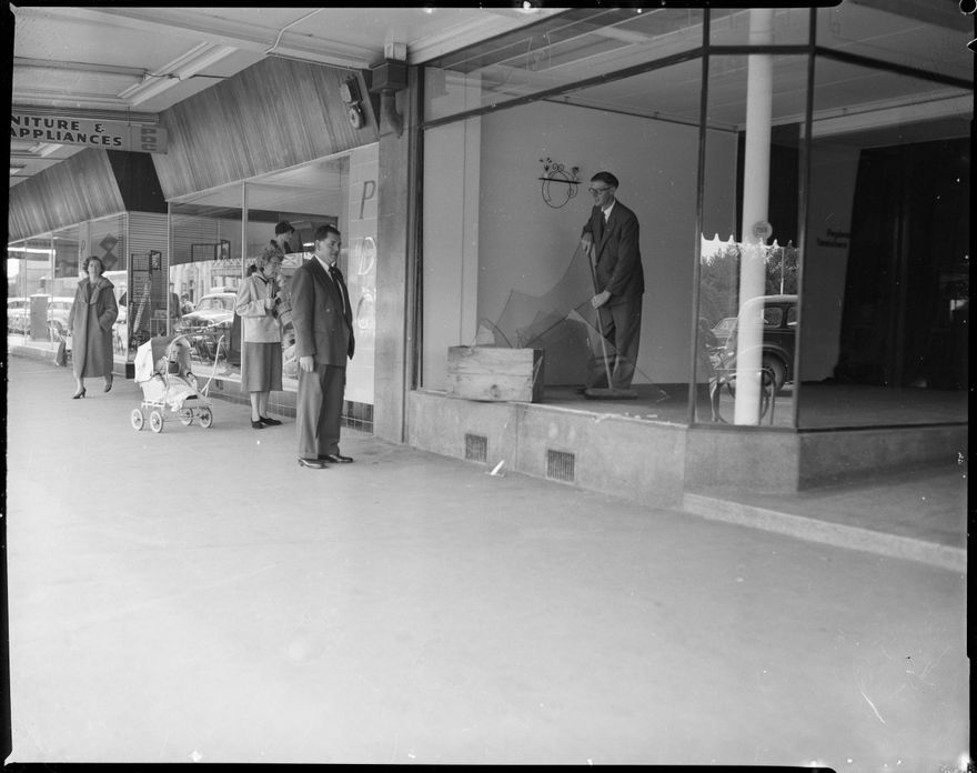 This image was taken for a story that ran in The Manawatu Evening Standard on 26 March, 1959. "The manager of Pegden's furniture store (Mr N. Cleaver) and his assistant (Mr J. Kyne) removing the fragments of glass from the display window which was shattered when a car crashed into it last night. The car, and another hit by it, were both extensively damaged."
