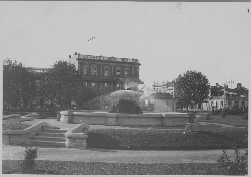 This fountain is in western quadrant - this photograph shows it before the Coronation monument for Edward VII was added on top (1925). The three-storied brick Clarendon Hotel was constructed in 1904, after fire had destroyed the earlier wooden hotel. Mr H Baker was the Proprietor. In 1927 the building was converted into shops and offices, and the top-storey of the building was removed after the 1931 Napier earthquake. It subsequently became the Bank of New Zealand. This building is now the Commercial Union and Westside Buildings that contains @ The Hub (a student hostel) and the Rangitikei Convenience Store.