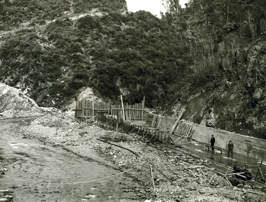 This photograph is one of a series made by Charles Wildbore showing the construction of the Mangahao hydro-electric power scheme in the Tararua ranges east of Shannon. This view shows the foundations being laid for the power house. The Mangaore Steam on the left was later diverted to flow along the concrete channel.