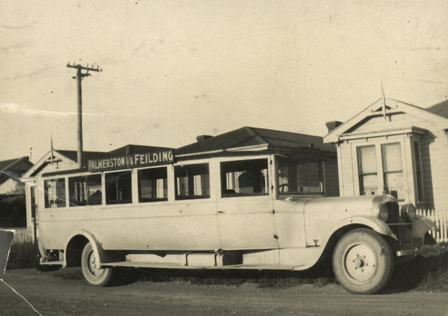 The bus is parked in Victoria Avenue, near the home of Len Madge, who drove the Palmerston North to Feilding bus in the 1920s. Madge Motor Service was founded in the 1920s by Thomas and Len Madge. It still operates today as Madge Coachlines, with a depot at 60 Bourke Street.