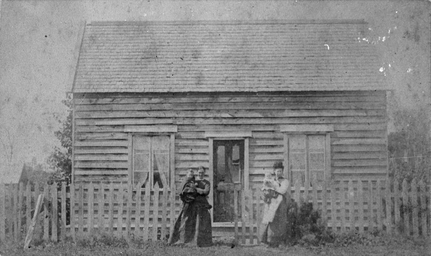 Mrs Anderson and Mrs Johanna Oden (nee Anderson), sisters, hold their babies outside a shingle roofed cottage, typical of the basic first home immigrants built in Palmerston North. Johanna Anderson married Carl Johan Oden in Palmerston North in 1881. They made their first home in Ashley Street, Palmerston North, before moving to build in Stoney Creek Road, Whakarongo, in 1896.