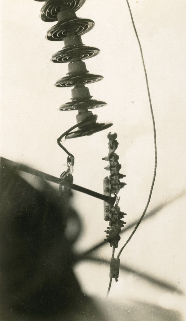 A close shot of a broken power line workmen had to repair.The Mangahao Power Station provides hydroelectric power and is situated near the town of Shannon. It serves Wellington, Horowhenua, Taranaki, Hawkes Bay, and the Wairarapa. After being delayed by the WWI, construction began in late 1919 and the station opened in November 1924.