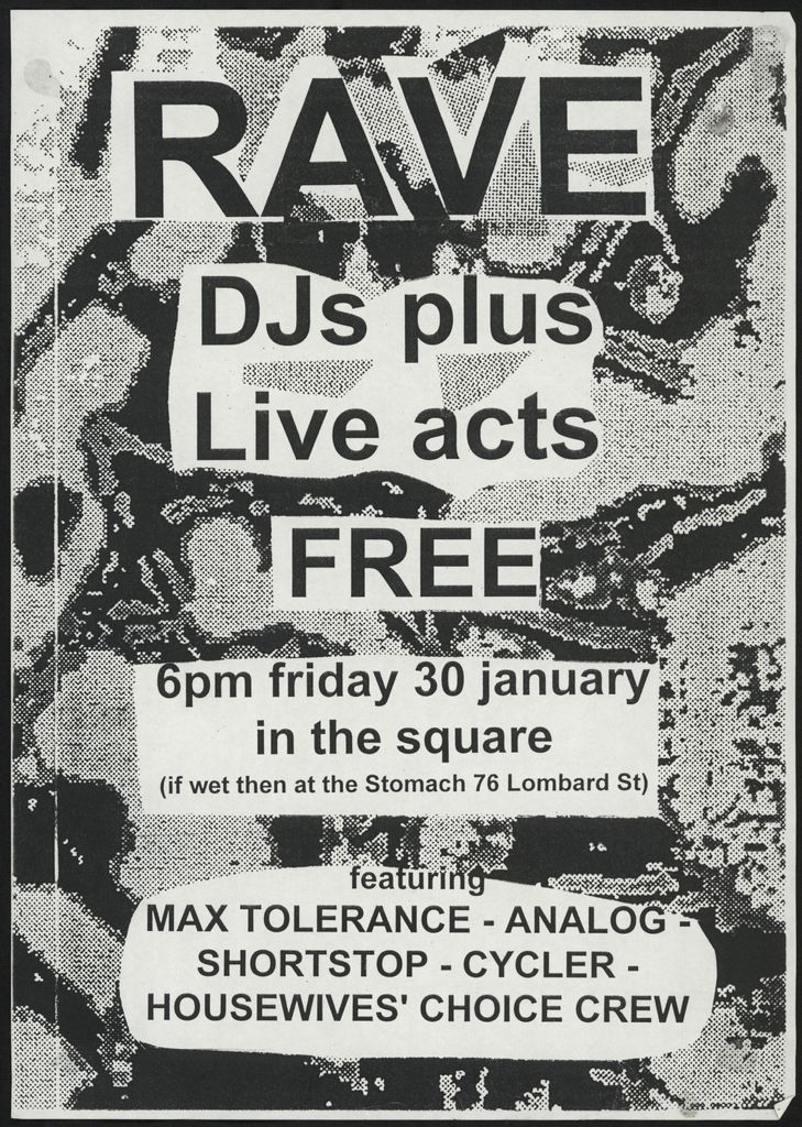 Rave. DJs plus Live acts. Free. 6pm friday 30 january in the square (if wet at the Stomach 76 Lombard St). Featuring Max Tolerance, Analog, Shortstop, Cycler, Housewives' Choice Crew.