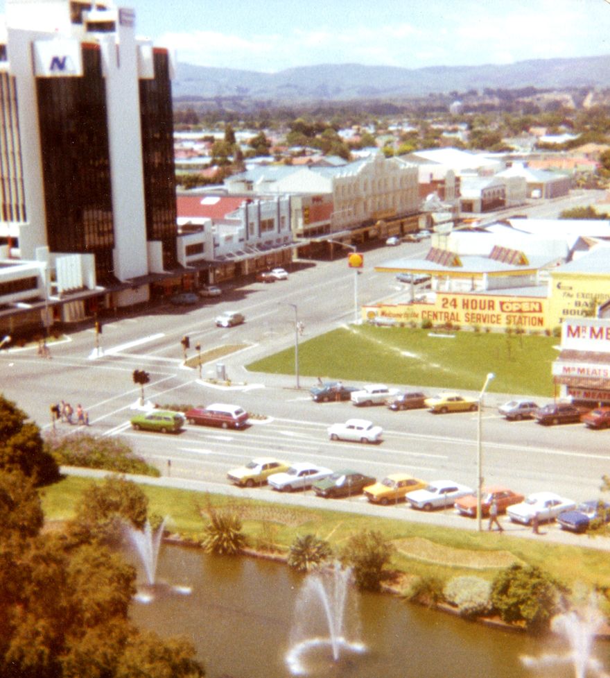 A view from the newly constructed Civic Administration Building, looking across the Butterfly lakelet to the start of Fitzherbert Avenue.