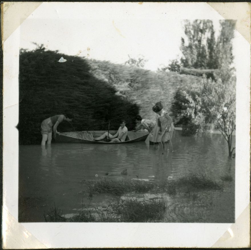 The 1953 flooding of the Manawatu and Oroua River was one of the worst on record for the area. This photograph shows a group of young people getting a boat out during the 1953 Rangiotu Flood.