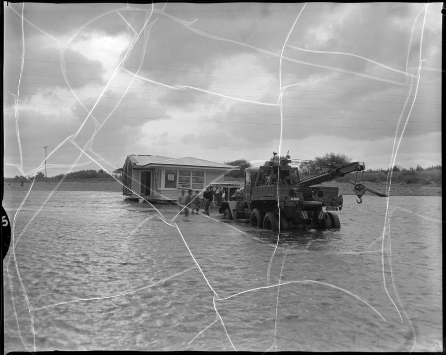 This image was taken for a story that ran in The Manawatu Evening Standard on 20th March, 1963. "With a portion of a £4000 house stranded in midstream in the Manawatu River and with dusk fast approaching, contractors who were transporting this house called in the New Zealand Army to assist yesterday afternoon. Two mobile cranes were sent and at 6:30pm the house was safe from the river."