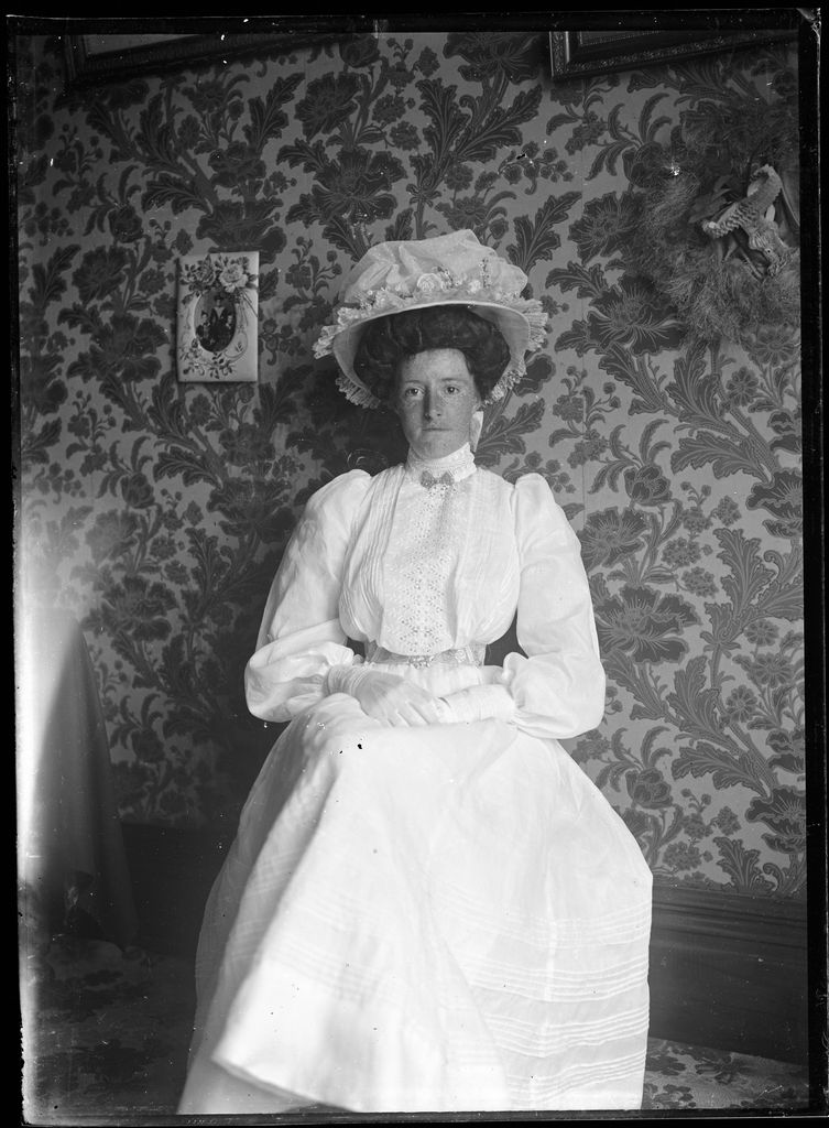 This photograph was created by William James Young in the early 20th century. The same unidentified woman (and distinctive wallpaper) appears in several other photographs, including: 2015G_Young27_010159; 2015G_Young111_010230; 2015G_Young164_010276.