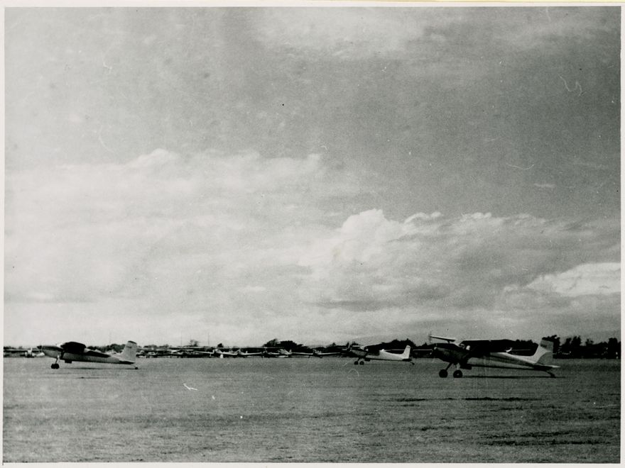 Possibly three Cesna Model 180s. The first International Agricutural Aviation Show was held at Milson Airport, Palmerston North, 9 - 10th November, 1956. Over 60 aircraft attended and a crowd of 2000 were entertained with a fly-pass of 64 planes.