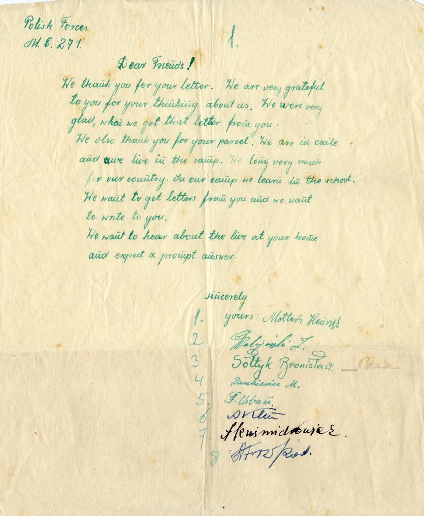 Letter from some of Polish Forces to the Polish Army League, thanking them for letters and parcels sent to them. The Polish Army League, founded in Palmerston North in WWII, corresponded with and sent parcels to Polish soldiers who served with the allies in World War Two.
