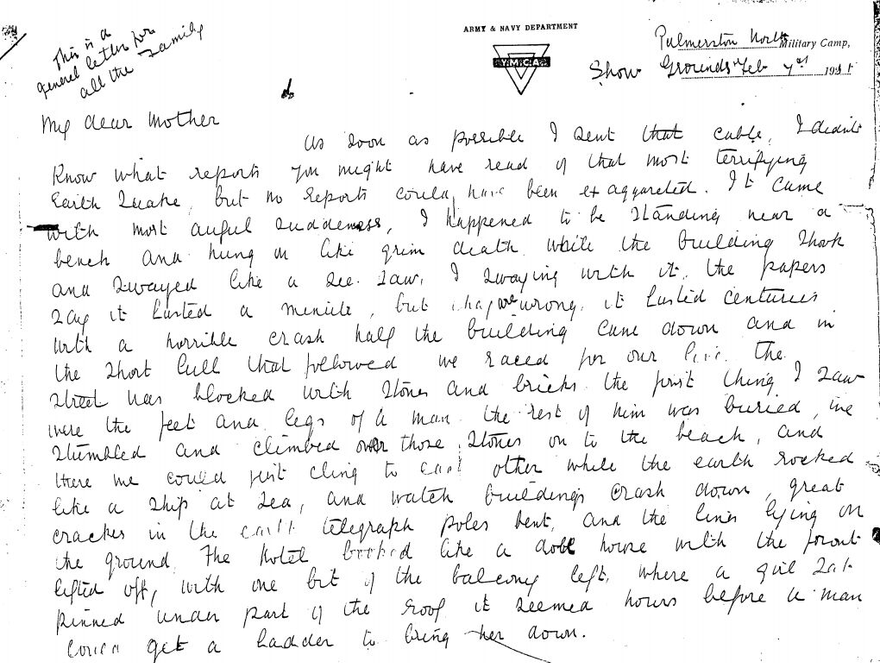 This letter was written by 'Mag' to family in England, from the evacuation camp at the Showgrounds in Palmerston North. Mag describes the earthquake and the first few days after in detail, the letter culminating after she arrives at the Showgrounds which had been set up to receive survivors.
