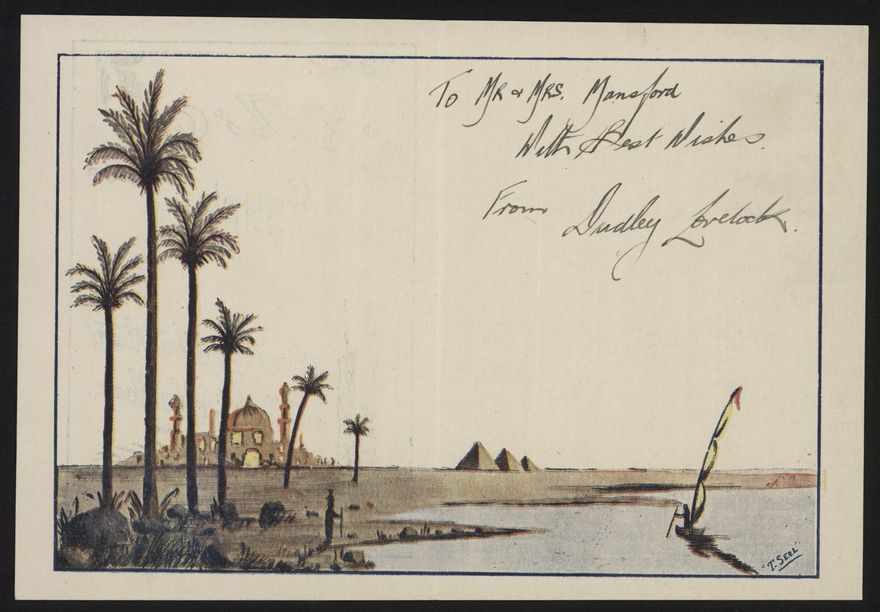 Christmas card from 1st New Zealand General Headquarters, Egypt. The inscription reads: "To Mr and Mrs Mansord. Wish best wishes. From Dudley Lovelock."