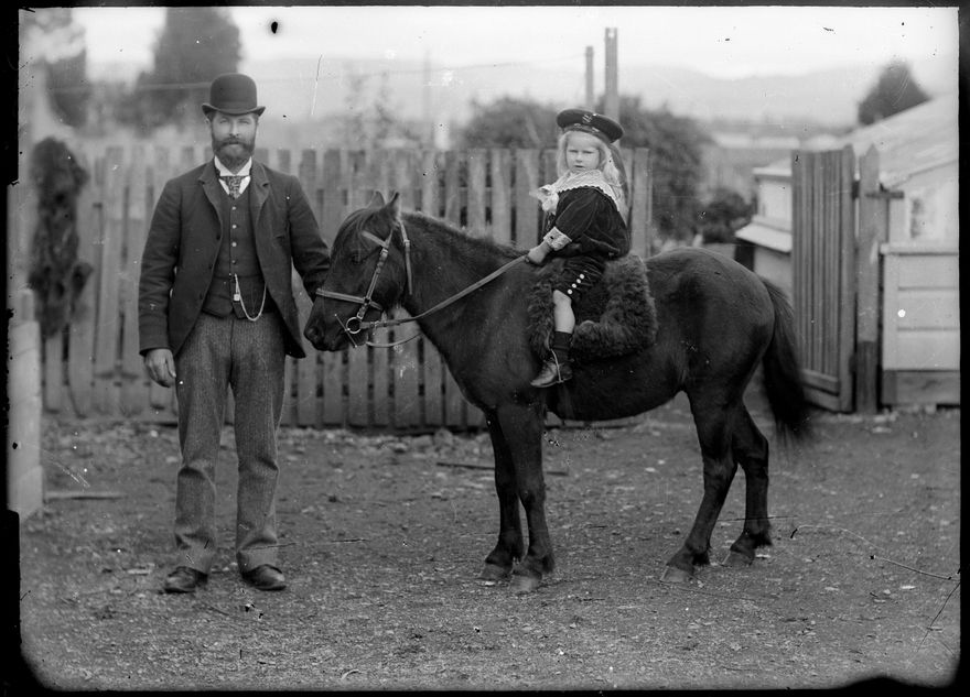 In this picture is an unidentified small boy in a velveteen suit, with a gentleman (possibly the father) holding the horse's reins.