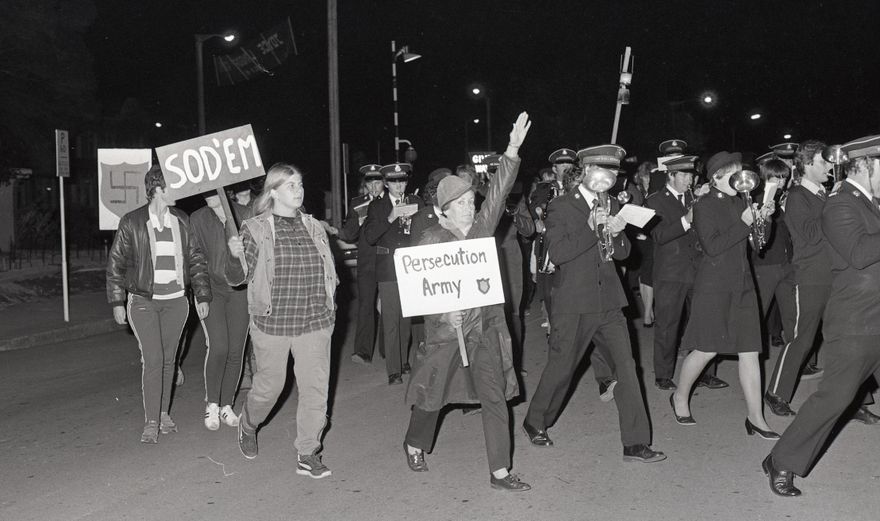 “Feilding Gay Task Force members flank the Salvation Army Centennial march through the town last night. About 15 to 20 task force members walked silently beside the march, letting their banners speak for them in their protest against the Salvation Army’s opposition to the Homosexual Law Reform Bill. Spokesman for the group Peter Pawson said the protesters were asked to stop, but the protest remained peaceful and non-violent.”