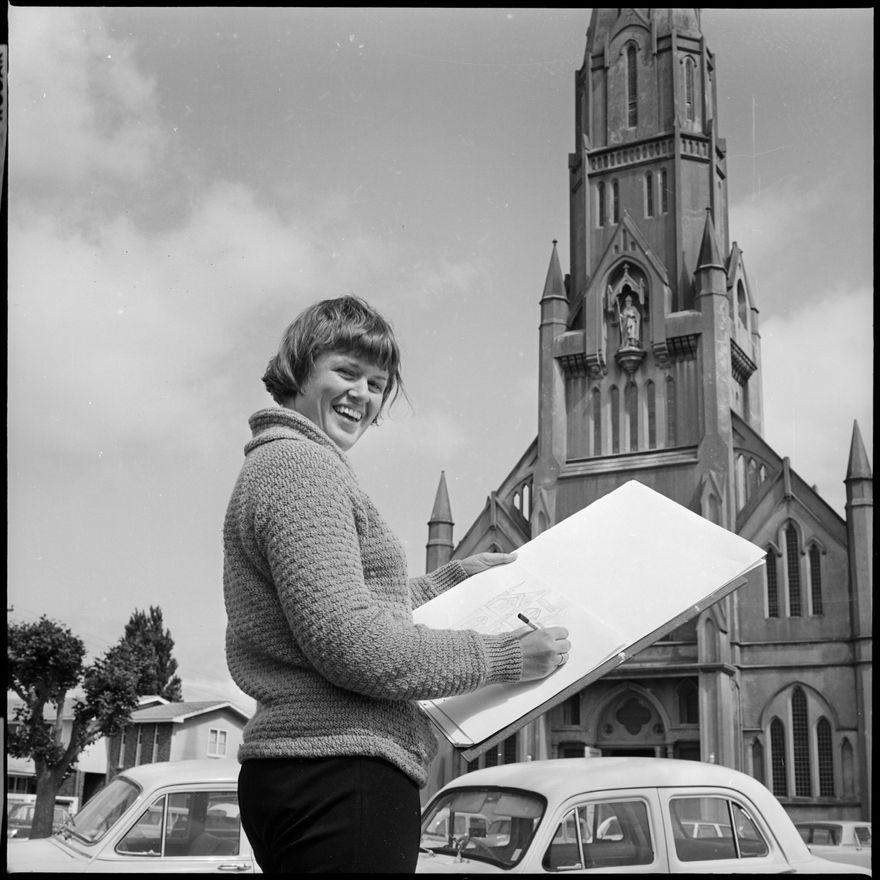 This image was taken for a story that ran in The Manawatu Evening Standard on 31st December 1965 "At seven o'clock this morning 18-year-old Miss Sally Rowe, of Palmerston North, was engaged on the task of sketching the front of St. Patrick's Church in Broadway. This work will be entered with an application for a four-year course at an art school in Wellington. This year Miss Rowe has been doing part-time commercial art in the city."