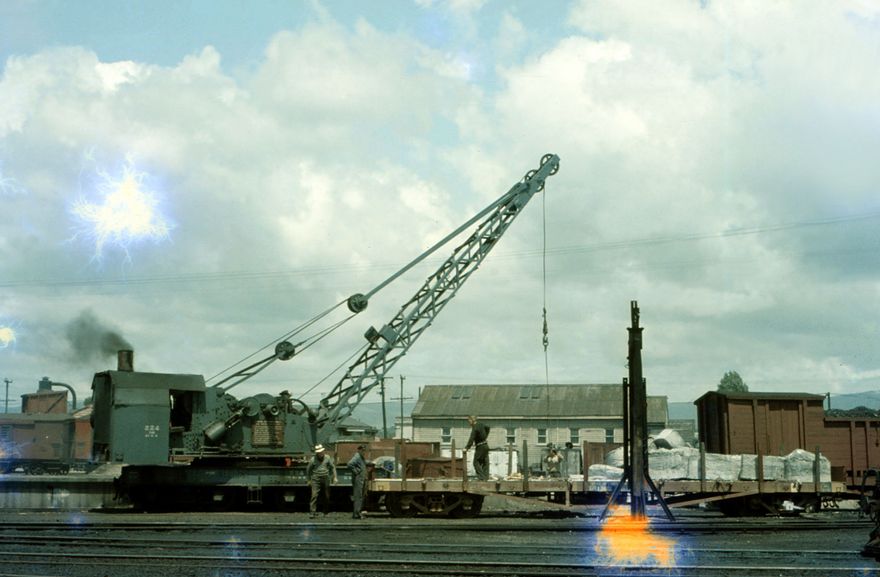 Workers operating a crane in the Palmerston North railway yards. The crane is possibly a 10 ton steam crane made by Cowans Sheldon & Co.