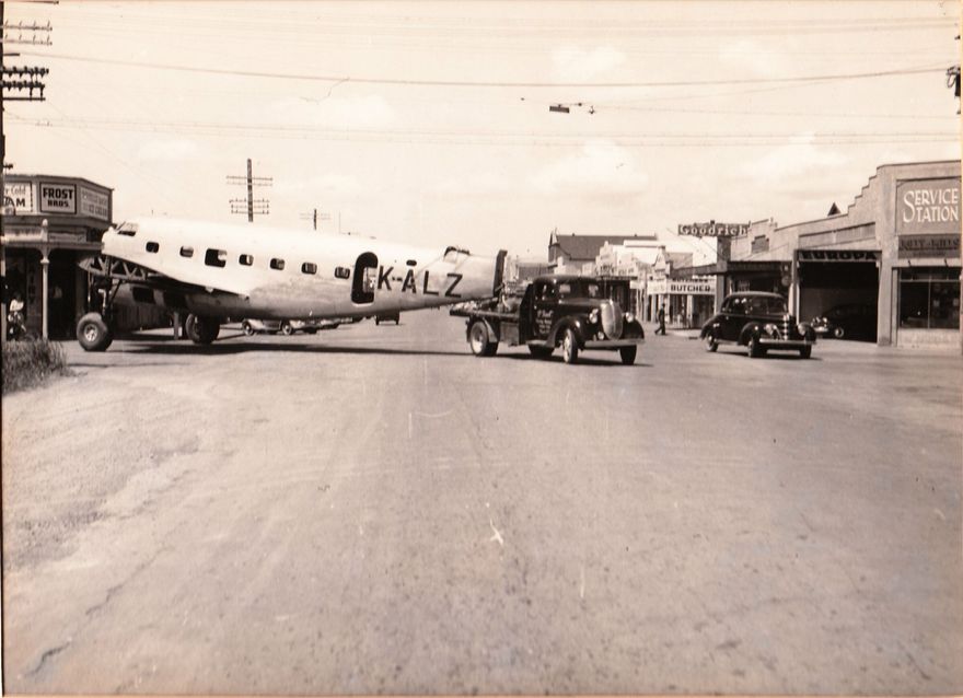 NAC aeroplane 'Koriri', registered as ZK-ALZ, was destroyed by fire prior sometime between the late 1940s - 1954. The plane was then towed to Kairanga (possibly to Jensen's) by Henry Percy Foot's truck. The plane was originally owned by the Dutch Air Force and registered as LT9-9, before being registered as VH-CAC in Australia. Bought by Aircraft Pty Ltd, who on-sold aeroplanes, it was then in the service of NAC with the name “Koriri”, before being destroyed by fire.