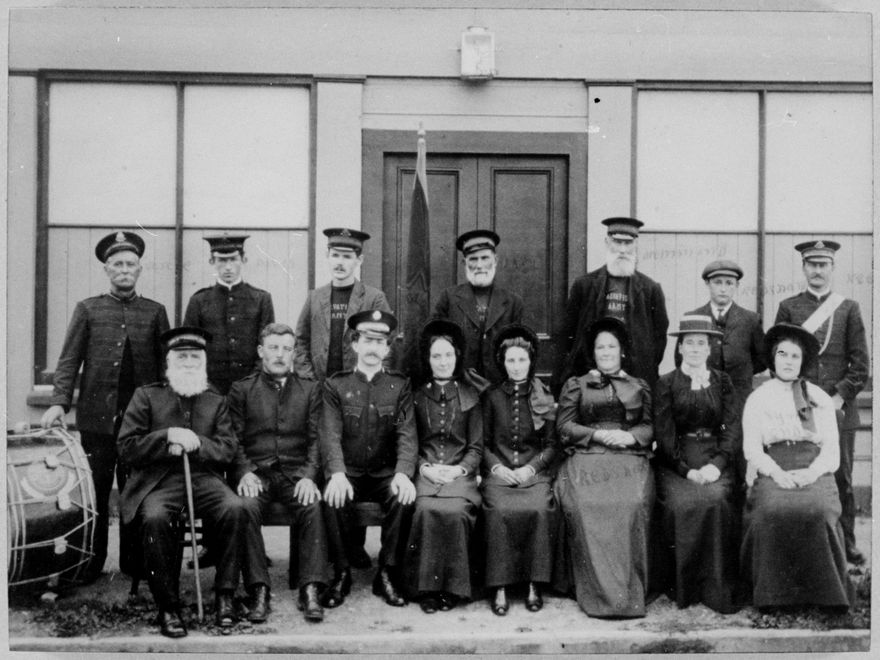 Outside the hall on 65 Winchester Street, Ashhurst. Back row, from left: Mr. Vercoe, Mr. Davis, Mr. Davis, Mr. Davy, Mr. Drummond, Mr. Redshaw, Mr. Keen. Front row: Dave [?], Mr. Craven, Ensign Wain, Mrs. Wain, Mrs. Harvey, Mrs. Redshaw,