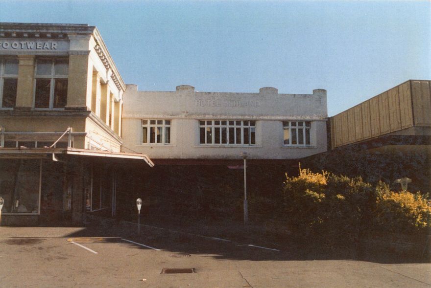 The building was constructed in 1913 for Arthur Hopwood, a prominent Palmerston North businessman, who leased the land. It became part of “Everybody’s Theatre” next door,and in 1928 the theatre was remodelled to become the Midland Hotel. Much of the hotel was demolished in 1966, leaving this portion remaining for retail shops.