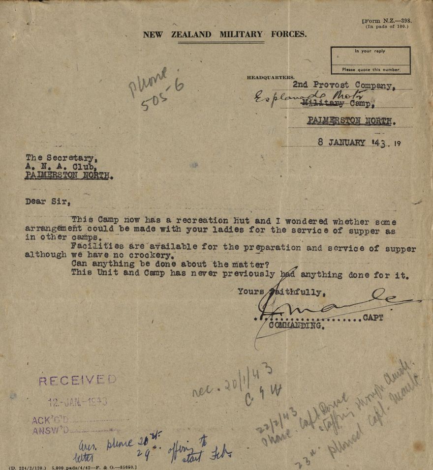 Letter to the Secretary of the A. N. A. Club of Palmerston North asking if the ladies of the Army, Navy and Air Force Club can serve supper to the 2nd Provost Company residing at the Esplanade Motor Camp.