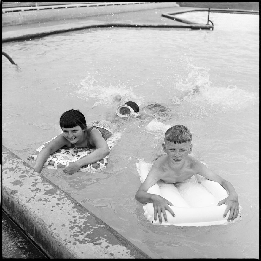 This image was taken for a story that ran in The Manawatu Evening Standard on 8th January 1966 "Enjoying a cool dip at the Memorial Park pool today are Heather, aged 12, and Brian Hicton, aged nine. In the background, investigating the depths is Trevor Connolly."
