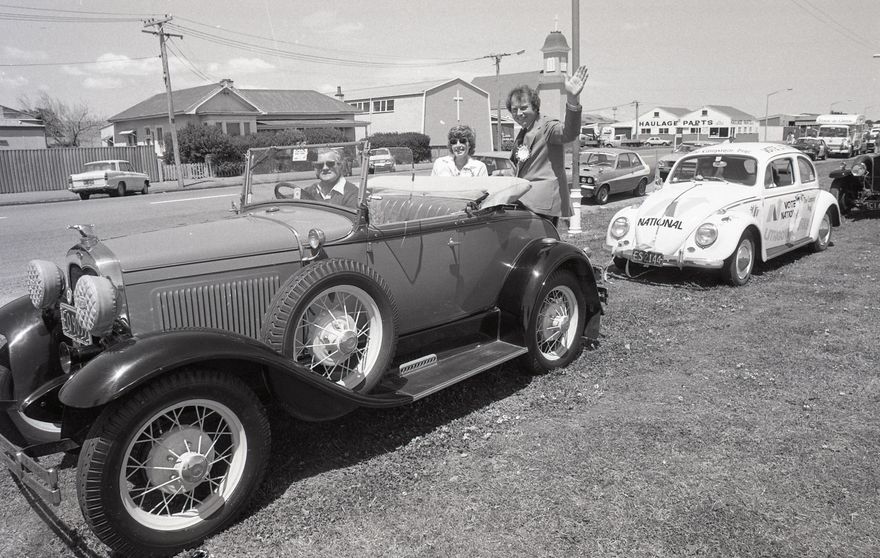 This image was taken (but not used) for a story that ran in The Manawatu Evening Standard on Wednesday 22 November 1978 National candidate for Manawatu, Michael Cox shares the cab of a vintage vehicle with his wife Jenny as part of Prime Minister Muldoon’s election campaign Road Show. Three vehicles containing the Cox’, National candidate for Palmerston North John Lithgow with his wife Ann, and the Prime Minister Rob Muldoon with his wife Thea set up along Church Street near the corner of McGiffert, opposite the railway land. Nearby businesses Kidd Garrett Ltd and Haulage Parts Ltd can be seen in the background. Once underway the touring party endured moderate heckling and protest placards, including one reading “Hope lies dying in a Muldoom tomb”.