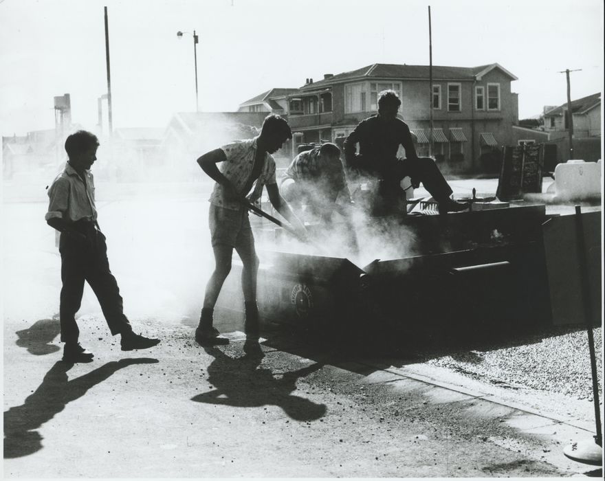 Workmen and a tar-sealing machine operating in what is presumed to be Palmerston North.