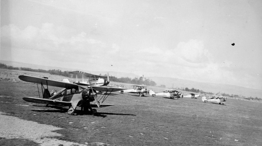 Thought to be the occasion of the air pageant held to mark the inauguration of Union Airways commercial service from Palmerston North 15 January 1936. ZK-ADE (nearest) was owned by the Manawatu Aero Club. Other planes from left: Vickers Vildebeste; NZAF Bomber; NZAF Bomber; ZK-ABY; NZAF Bomber. The NZAF bombers are AVRO 626 aircraft, used for pilot/ observer training and were based at RNZAF Wigram.