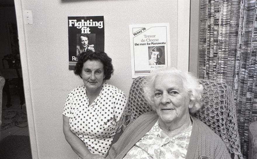 This image was taken for a story that ran in The Manawatu Evening Standard on Friday, 7 November 1978 “Vision of a better life: Mrs Boyle, left, and Mrs Chandler, with their men of the moment, Bill Rowling and Trevor de Cleene.” Lettie Chandler (aged 77, formerly Mrs Lettie Allen) founded the Tangimoana branch of the Labour party in September with the assistance of her Australian based daughter Kath. Both women were motivated not so much by party loyalty, but by social welfare improvements for the elderly residents of the beach.