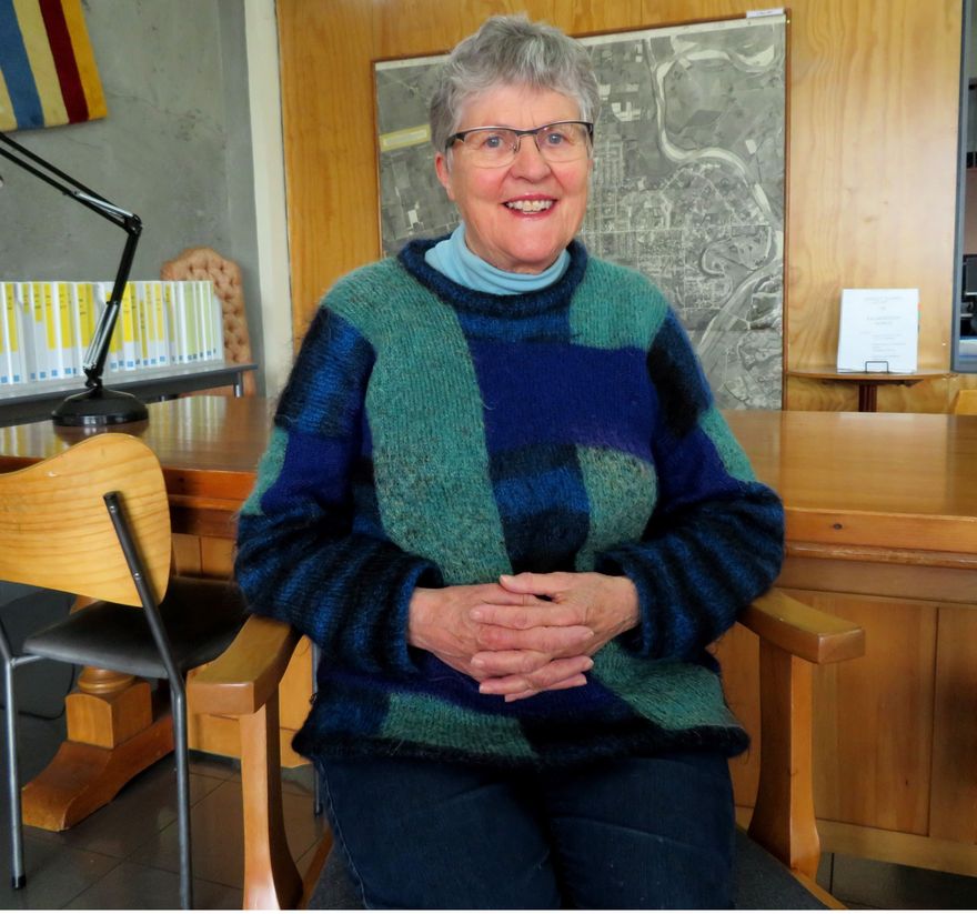 Former Mayor Jill White sitting in the Archives Reading area of the City Library.