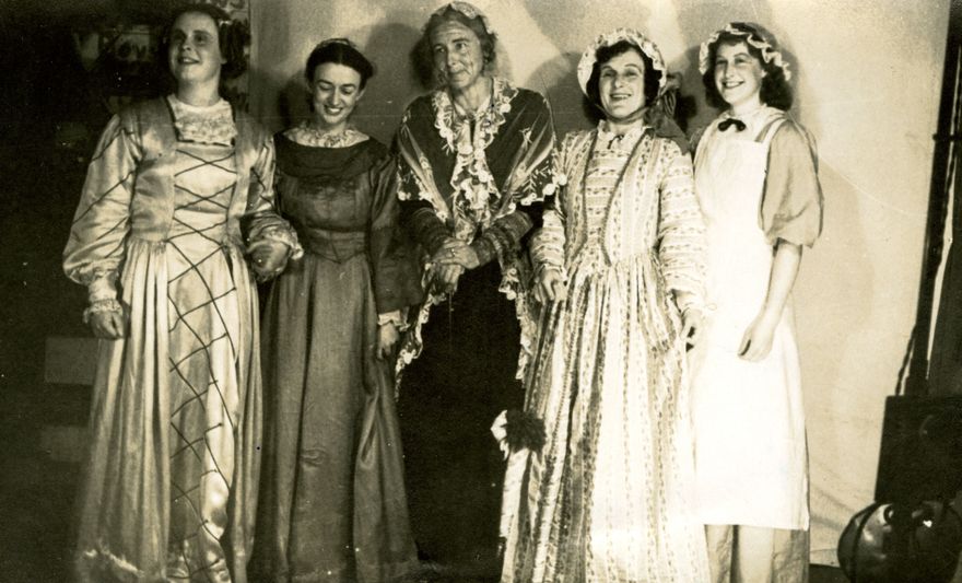 This group were the winners of the Inter-House Drama Festival in 1943, where they won the Rees Cup outright. This may or may not be a shot from the winning production. From left: Pat Christmas; Mavis Brabyn; Unknown; Jean Thompson; Lily Moxham.