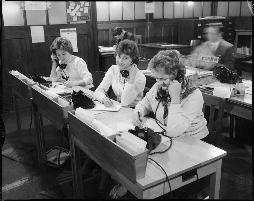 This image was taken for a story that ran in The Manawatu Evening Standard on 08 September 1961 "On call throughout the day are the "Manawatu Standard's" three office assistants trained to take down the particulars of the numerous advertisements which are telephoned into our office. They are (from left): Misses T. Hickey, M.Z. Woller and M.J. Lockyer. Just telephone the "Standard" and you will have your advertisement taking by one of these you women."