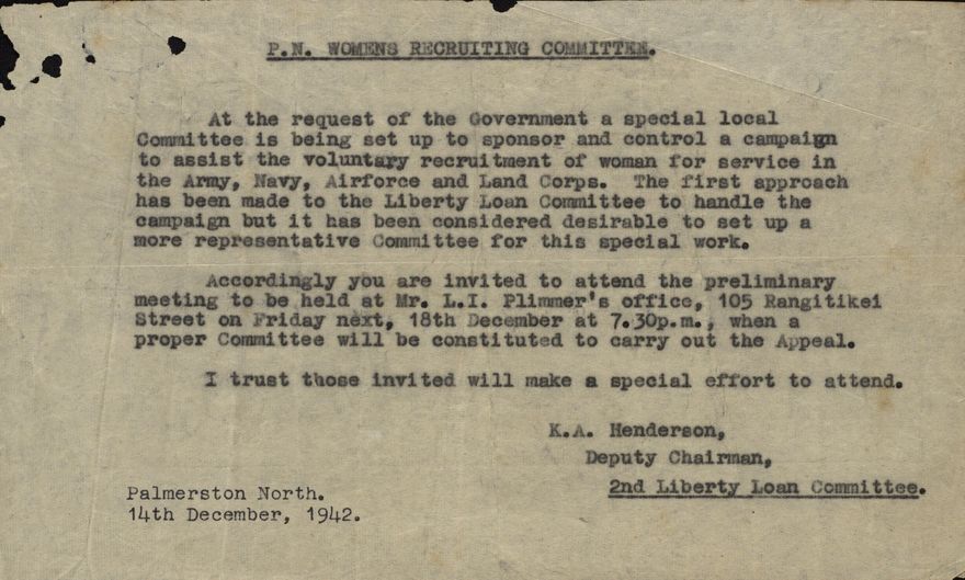 Letter from K A Henderson, Deputy Chairman of the 2nd Liberty Loan Committee, regarding the setting up of a local women's recruiting committee, to assist the voluntary recruitment of women for service in the Army, Navy , Airforce and Land Corps during WWII.