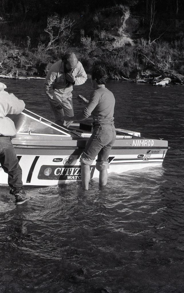 This series of images were taken for a story that ran in The Manawatu Evening Standard on 22 September, 1978. The article details a mid-river collision in the Manawatū Gorge during the Manawatū River stage of the 1978 CItizen Watch Jet Boat Marathon. The two boats that collided were Campbell Wilkie's "The Ugly" and Hilton McLachlan's "Ruffian" (with Ross Baker and Charles Hughes as crew). A third boat skippered by Bryan Harvey sustained damage whilst avoiding the collision. The photograph of P. Bayens' boat included in the article was not found with the negatives.