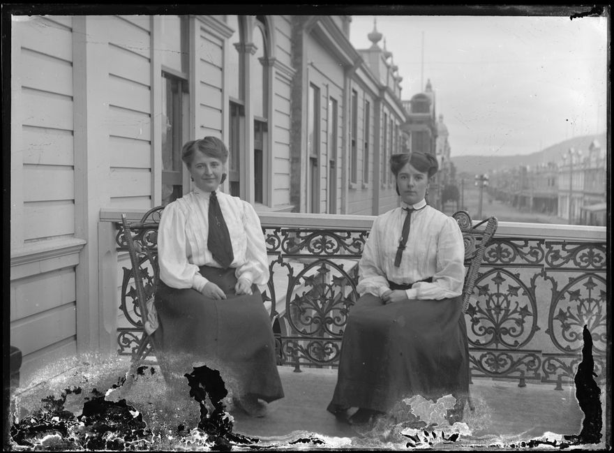 This photograph was created by William James Young in the early 20th century. A large variety of subjects are depicted in the collection, but family, rural life and travel are the most prominent themes. The exact location of the photographs in the Young Collection is unknown, but W J Young lived on a farm in Mt Stewart, Rangitikei, and some of the photographs include his house. The Young family were apparently avid travellers and photographs later in the collection feature scenes from Rotorua, Auckland, Whanganui, as well as other unidentified locations. The portraits are all unidentified, but are presumably of members of the Young family. The photographers parents were George Henry (b 1833) and Jane McDowell (b 1842, d 1916). They came to New Zealand in 1877. The same year, they bought the home farm on Mt Stewart and called it Kilrudden after Kilrudden House, the home of the McDowell family in Ireland. The couple had four children: Ann (b 1873), Margaret (b 1876), John (b 1878) and William James (b 1880). William James married Mary Elizabeth Thompson and they had four children: Doris (b 1914, d 1989), George (b 1916, d 1991), Royden McDowell (b 1925, d 1992) and Noel William (b 1927, d 2013).